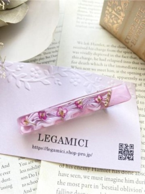 ピンクベースに ピンク×ホワイトのマーブル模様 そして、「奥ゆかしい美しさ」や「優美」などの 花言葉を持つアリッサムを封入☆ ストーンでアクセントをつけた 女性らしいヘアクリップに仕上げました。