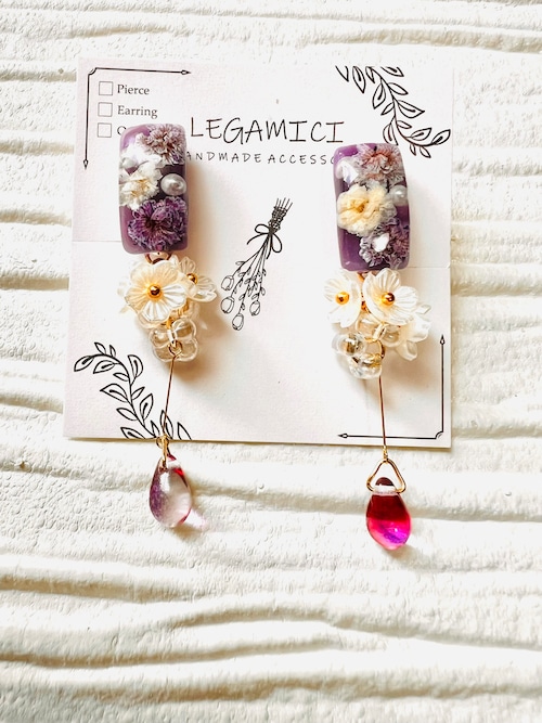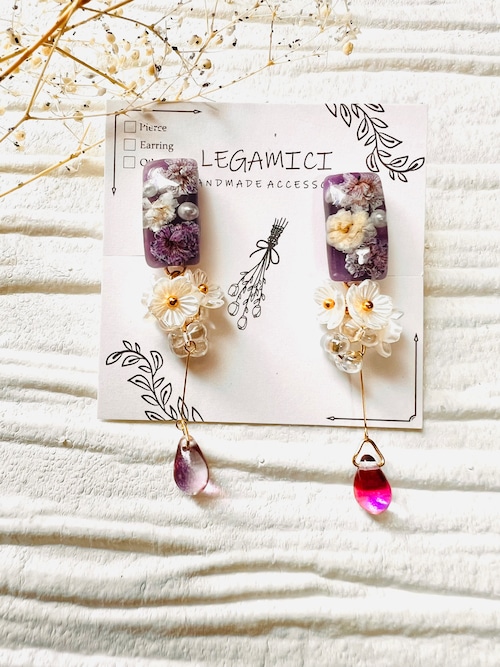 スクエアのフォルムに閉じ込められたかすみ草は、どんなシーンにもぴったりなアクセサリーとして活躍します。身につけるだけで、女性らしい可愛さがグッと引き立ちますよ。幸せな気持ちを引き寄せるとも言われるかすみ草を身に纏い、日々の生活に明るさと幸せを運んでくれることでしょう。